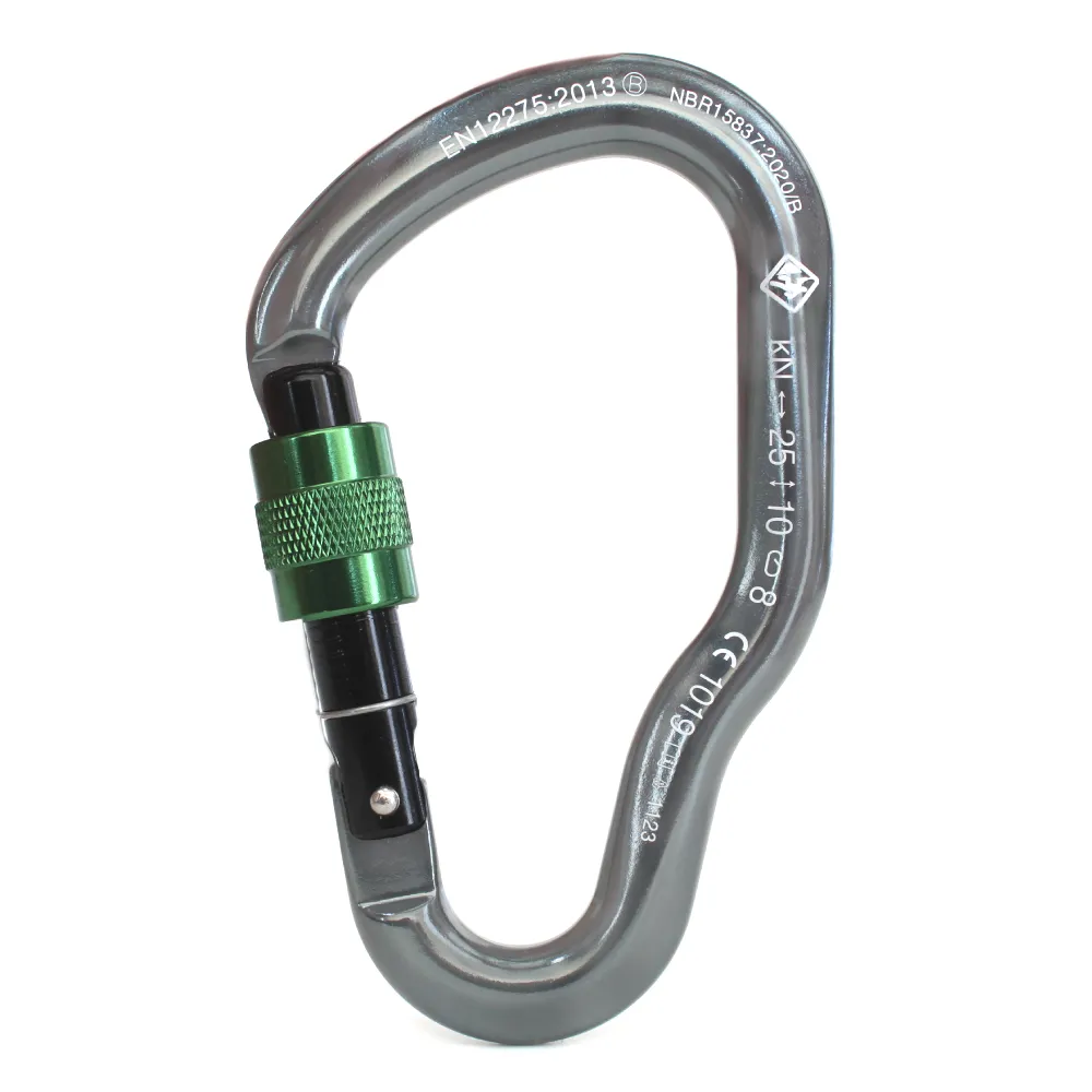 O mosquetão possui uma leve curvatura na parte oposta ao gatilho para facilitar o manuseio nas ancoragens.